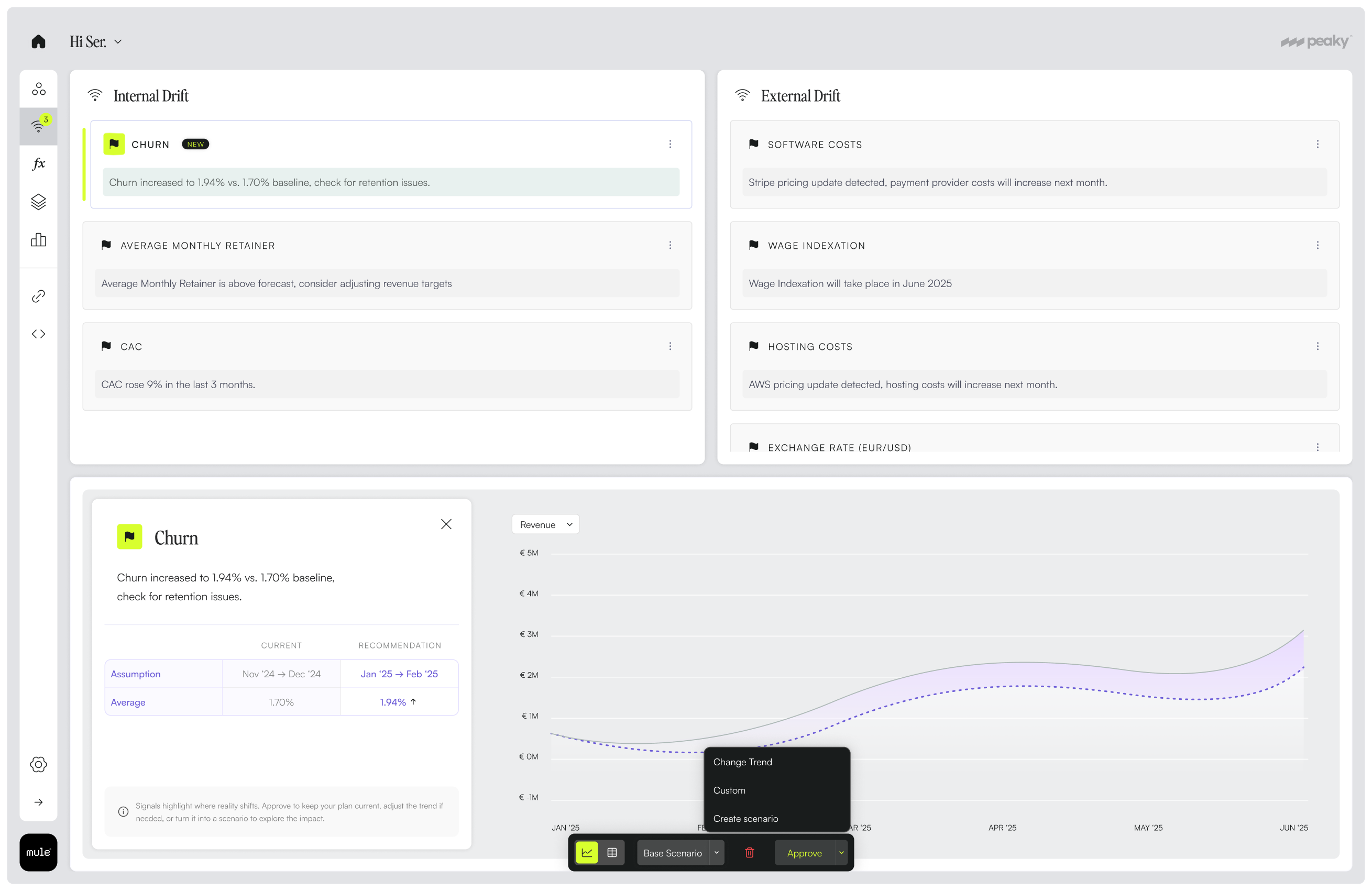Peaky’s Signal Engine tracks leading indicators beyond your own books, from market shifts and supply chain disruptions to changing investor sentiment. When the world moves, Peaky shows you what it means for your numbers, so you can act before it hits.
